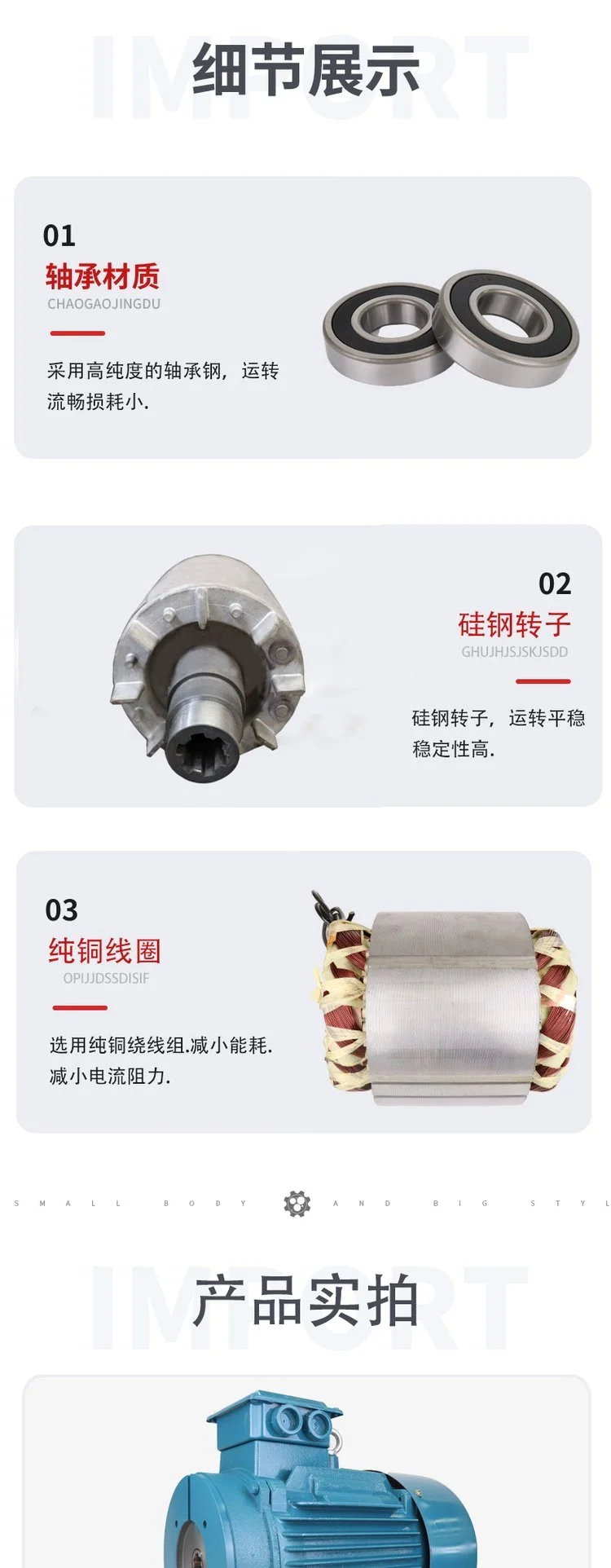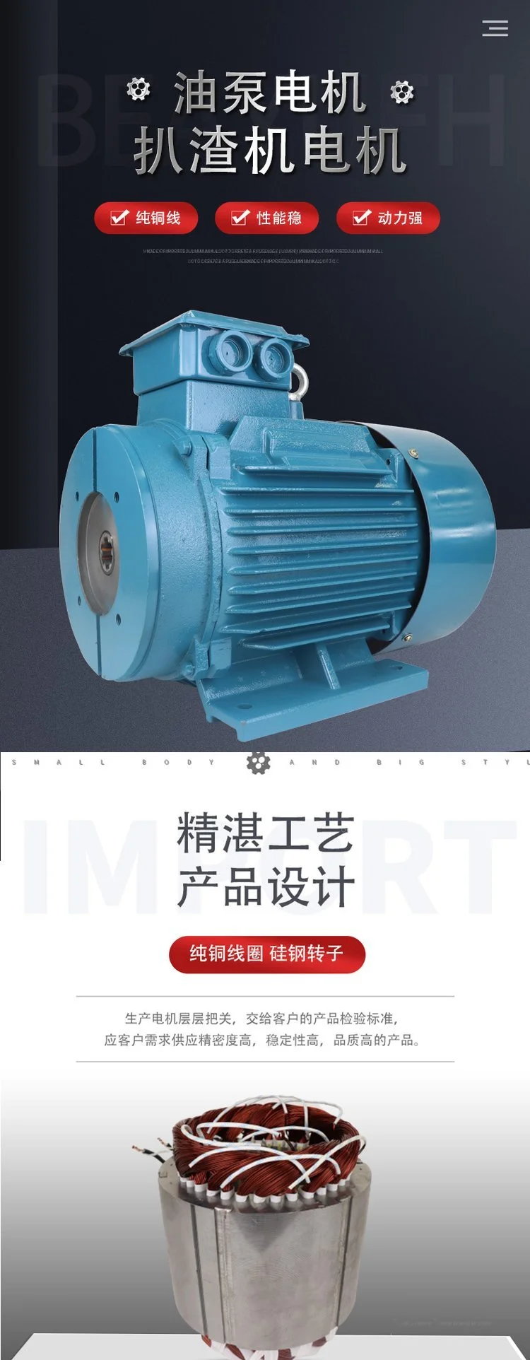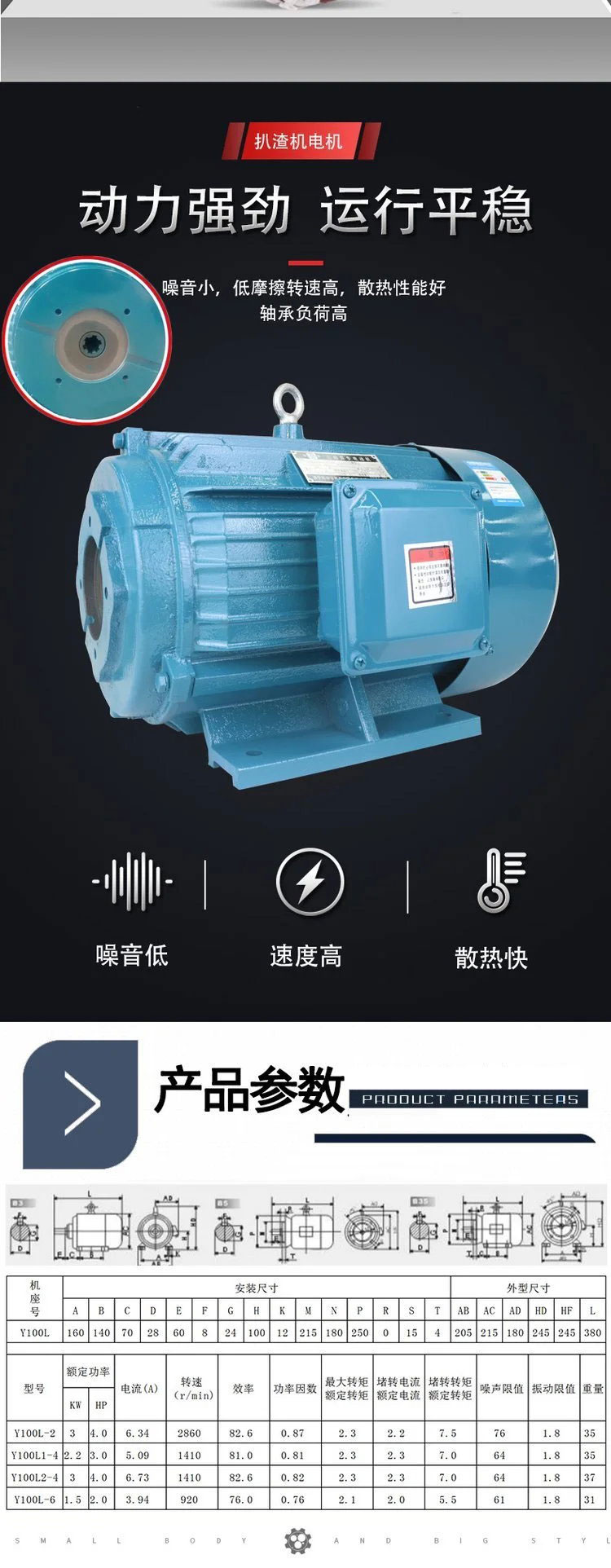 适用范围:液压专用电机用于与液压系统配套,可与柱塞泵、叶片泵、齿轮泵等各类油泵配套,组成油泵电机组。与传统的油泵电机相比,具有以下优点: